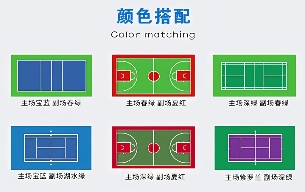 球场系列:硅PU球场、丙烯酸球场、室内PVC地板、悬浮地板、预制卷材等