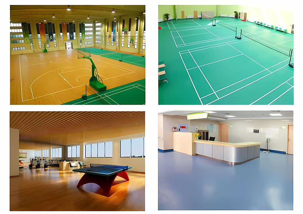 四、PVC材料地面工程:室内PVC球场铺设,篮球场、网球场、羽毛球场、乒乓球场、健身房、医院等