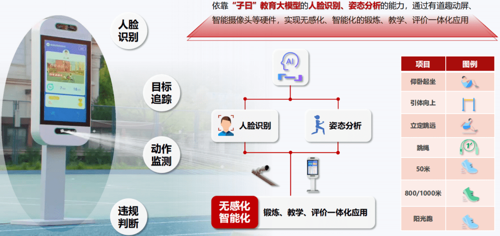 该套系统利用AI视觉计算分析引擎,无感采集、分析学生跑步学情,建立学生运动学习的个人画像。学生可通过操场户外大屏上查看自己的实时运动数据以及每日排行榜。